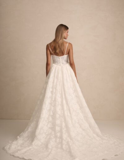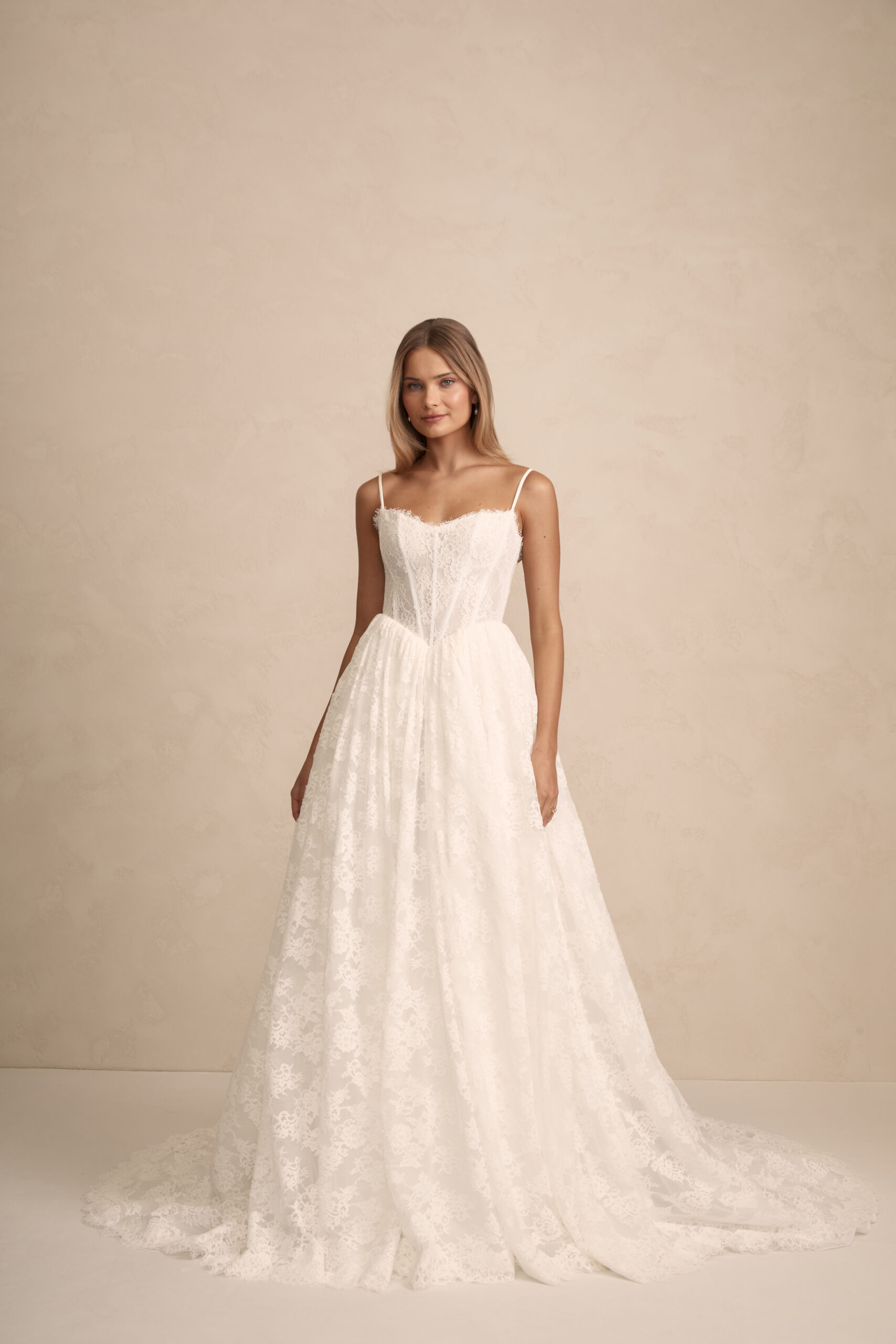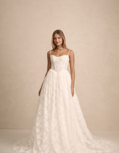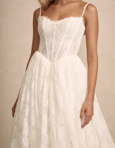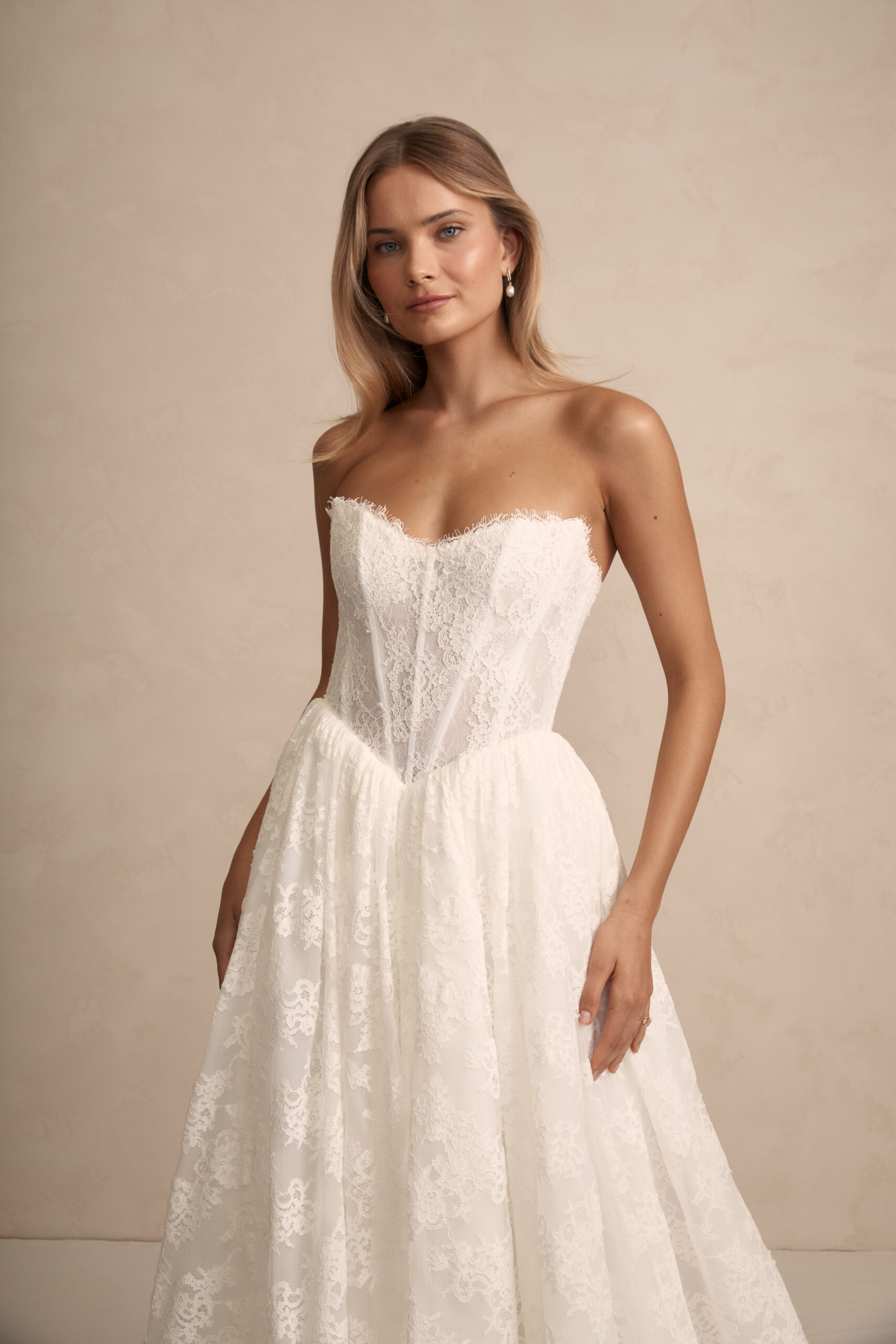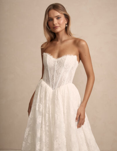 Prim features a flattering bodice with a modern Basque waist for a flawless fit. Internal boning and optional delicate straps provide comfort and elegance, while her gathered skirt flows beautifully with every step.