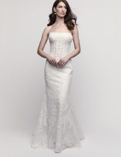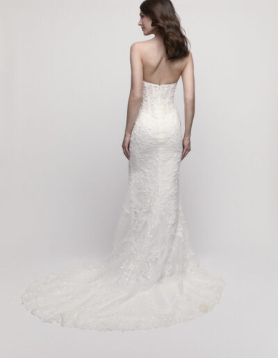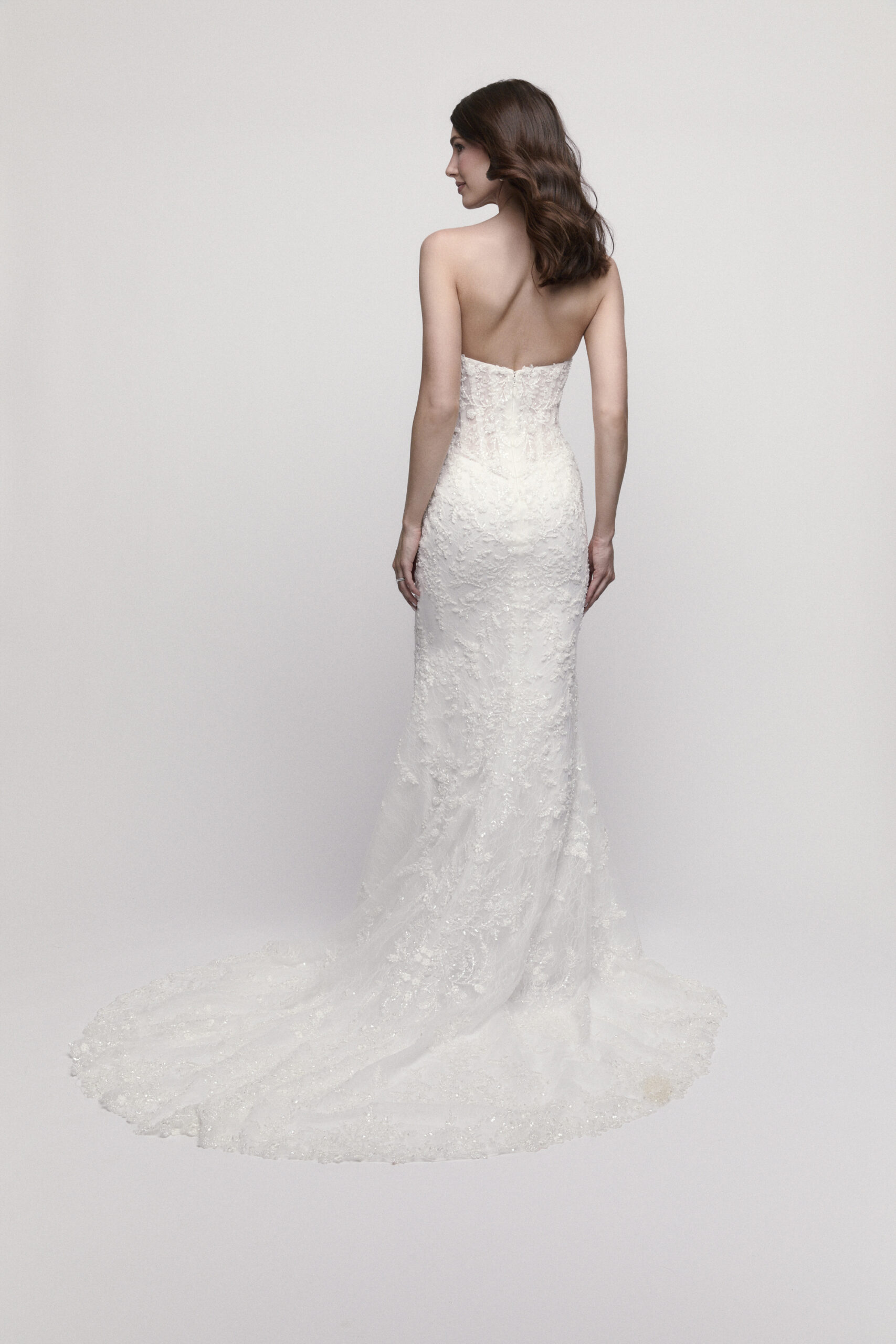 Amaranth is unapologetically dramatic, designed for the bride who wants maximum impact from every angle. This sleek sheath silhouette is covered in intricate beading that catches the light with every step, creating a high-shine finish that feels bold, confident, and undeniably glamorous. The strapless neckline features a clean, modern shape that balances the richness of the embellishment with a refined edge, keeping the look elevated and current.