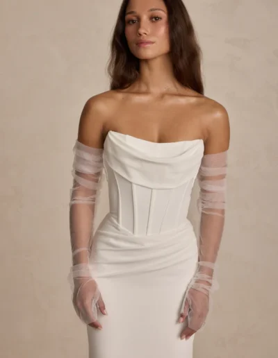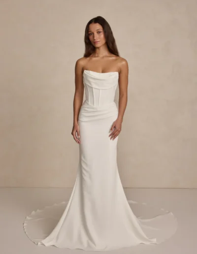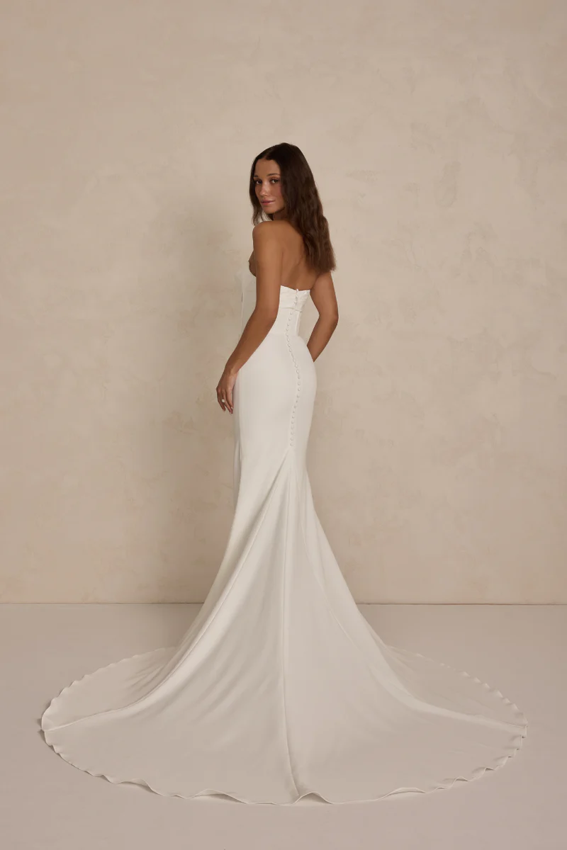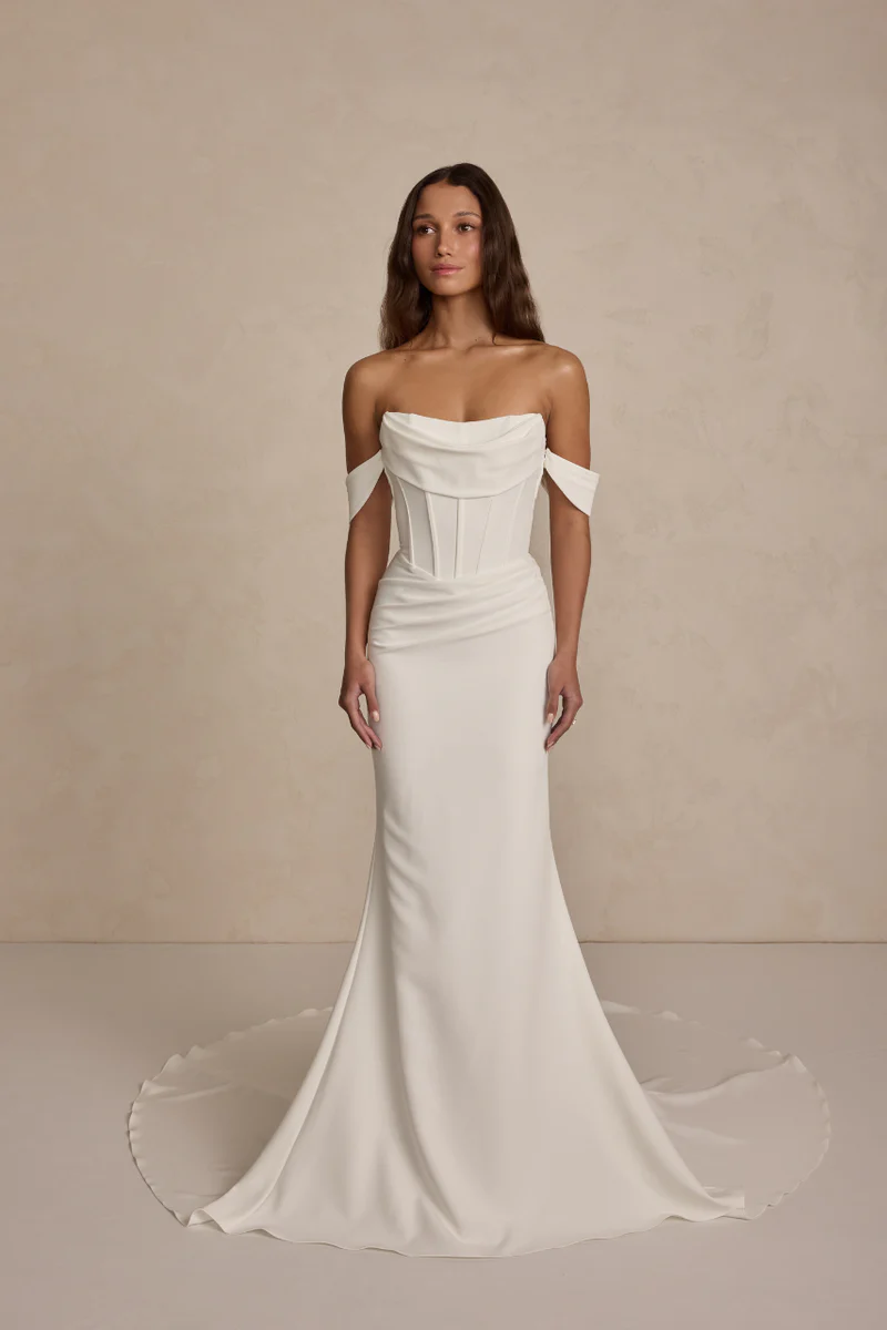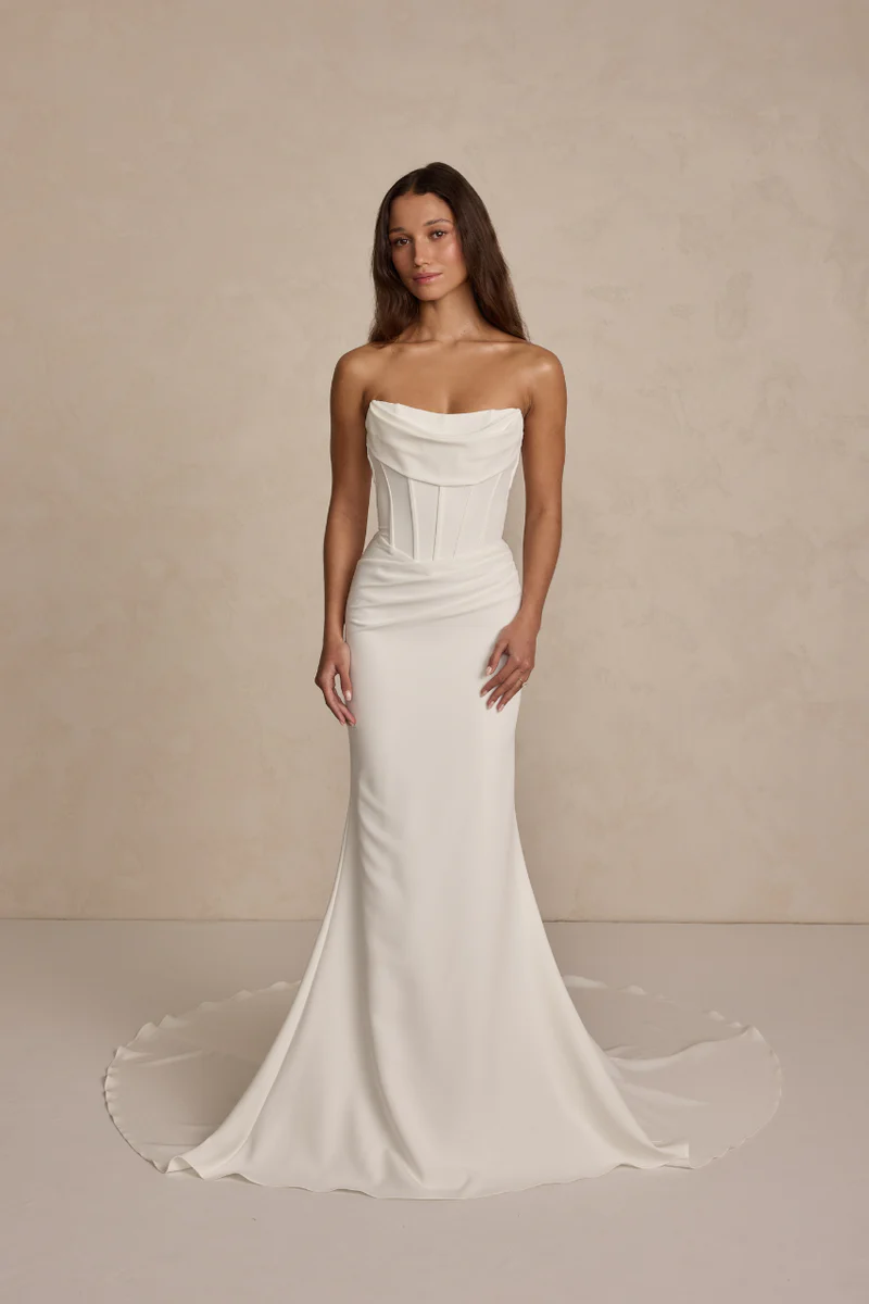 Crafted from the beloved Celine bodice and Rhode skirt, the Cruz Dress masterfully balances structure and movement. The corseted Celine bodice sculpts the waist with refined definition, while the Rhode skirt in soft crepe fabric flows effortlessly, creating a silhouette that is both commanding and graceful. This dress makes a striking statement where timeless craftsmanship meets modern elegance.