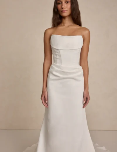 Elegant and architectural, the Knox is a fresh take on timeless sophistication. Featuring a newly developed bodice pattern inspired by our iconic Celine dress, Knox offers a refined silhouette with internal boning for structure and support. A soft, sculptural cowl detail graces the front bodice, adding a touch of modern romance.
