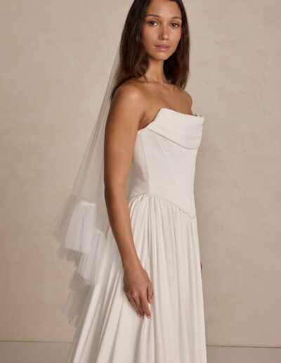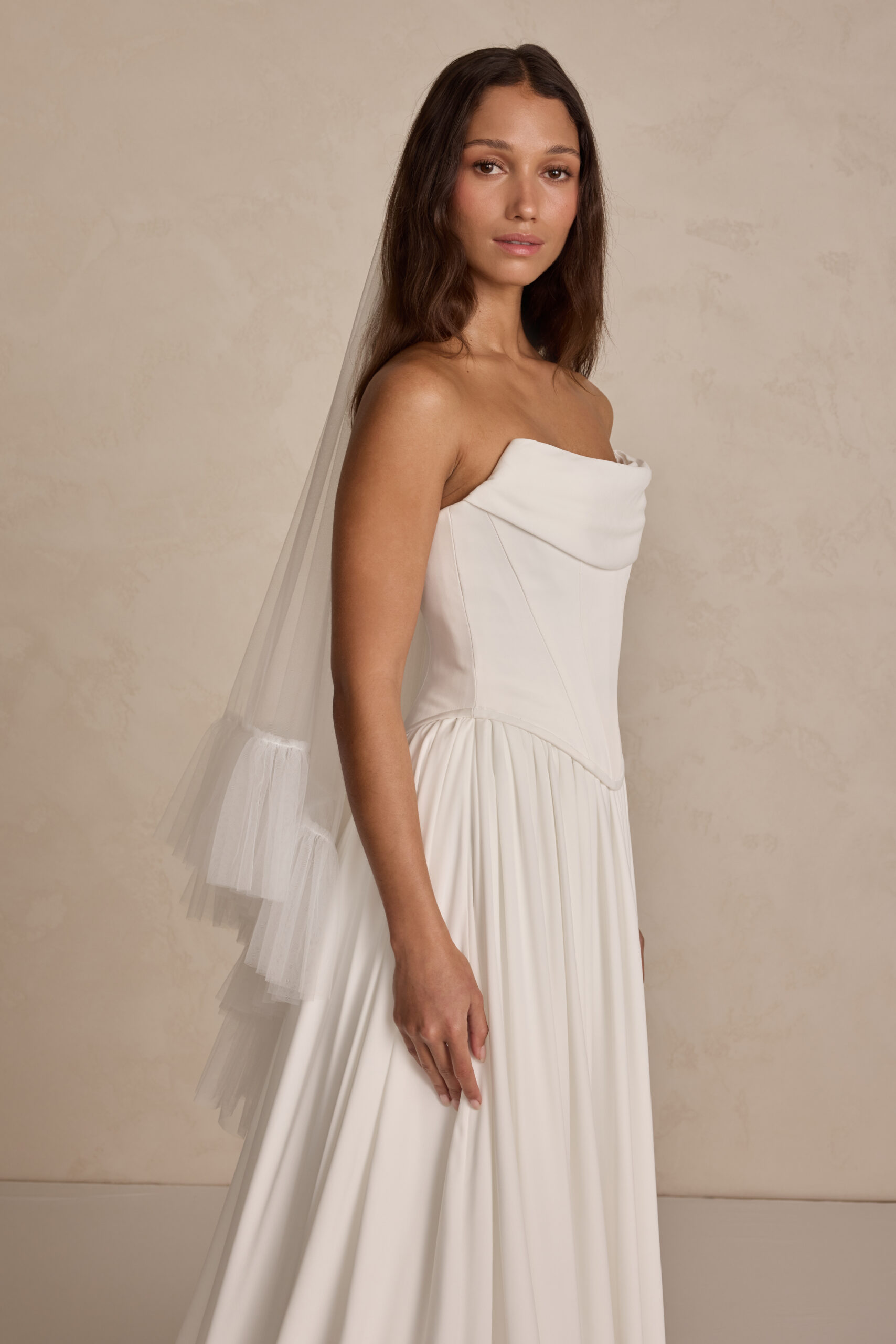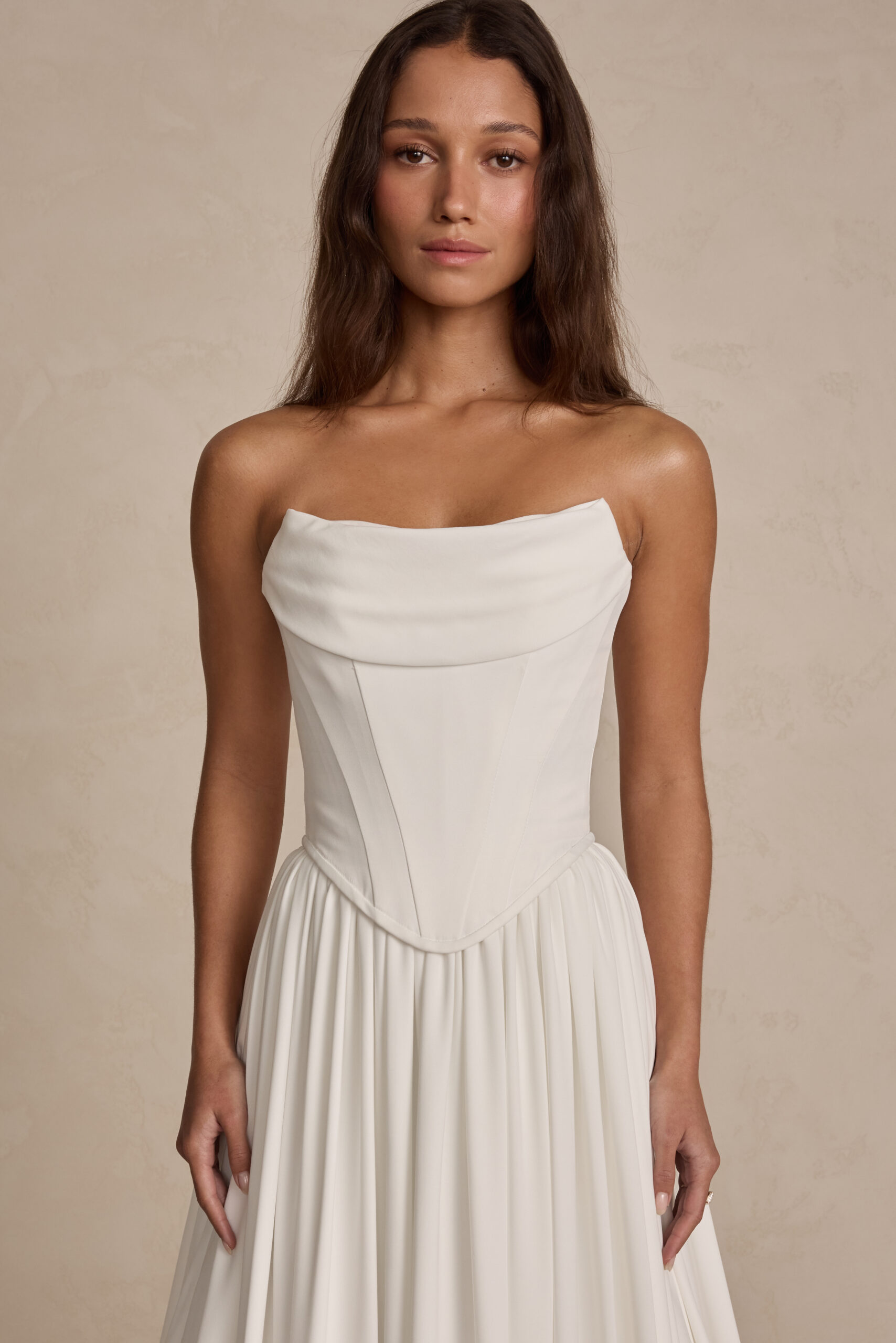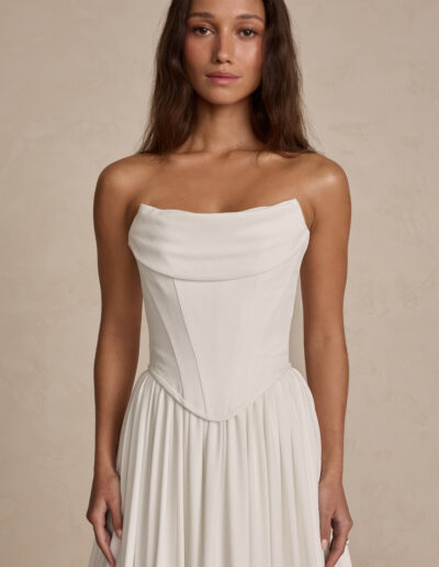 Tate is a modern take on structured elegance. Featuring a sculpted bodice crafted from our luxurious Delusted Duchess Satin, this design offers a firm and flattering fit. The flowing skirt, made from our newly developed chiffon, beautifully mirrors the soft cowl detail of the bodice, creating a balanced and harmonious silhouette.