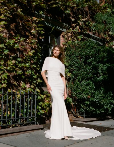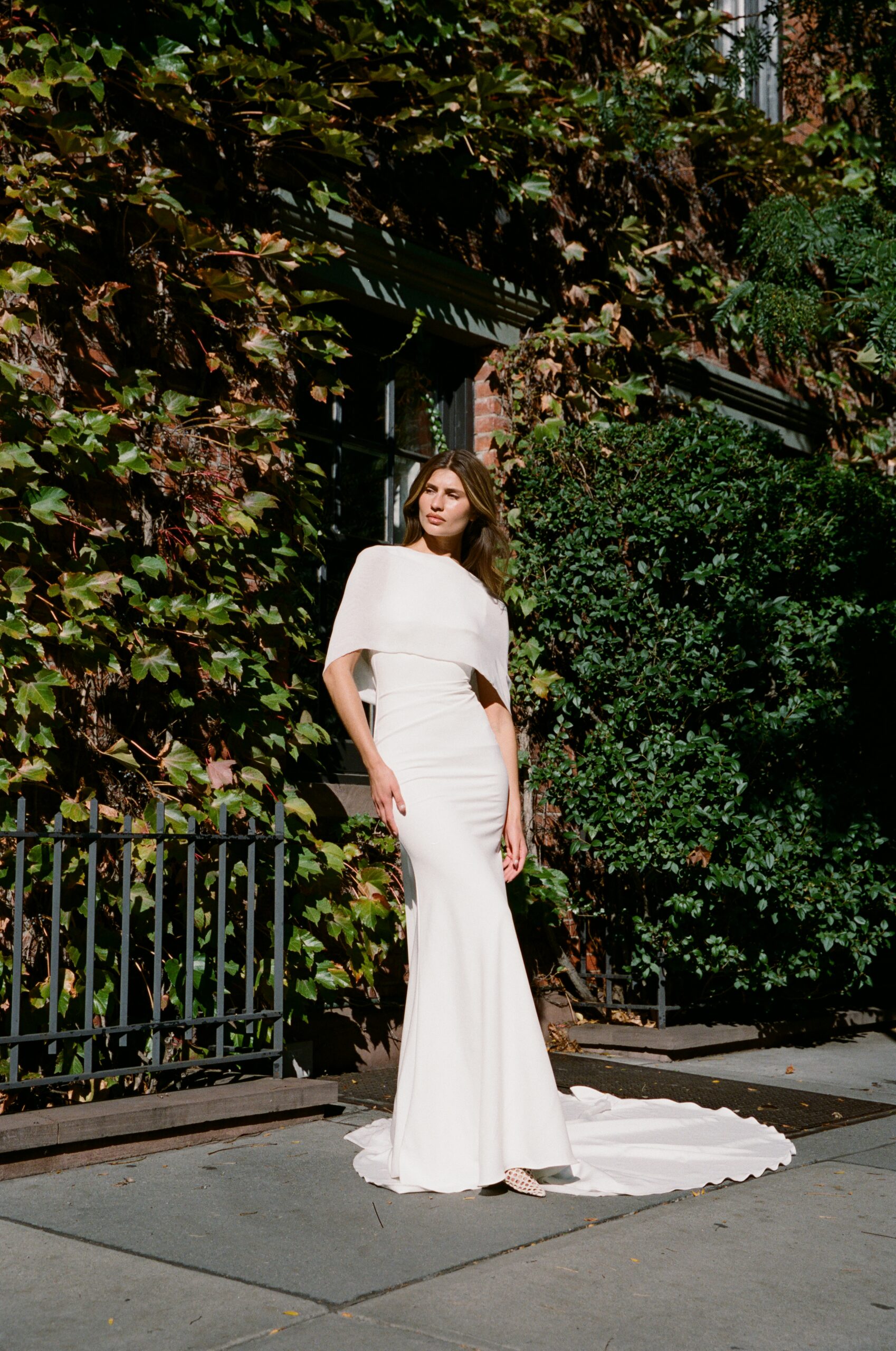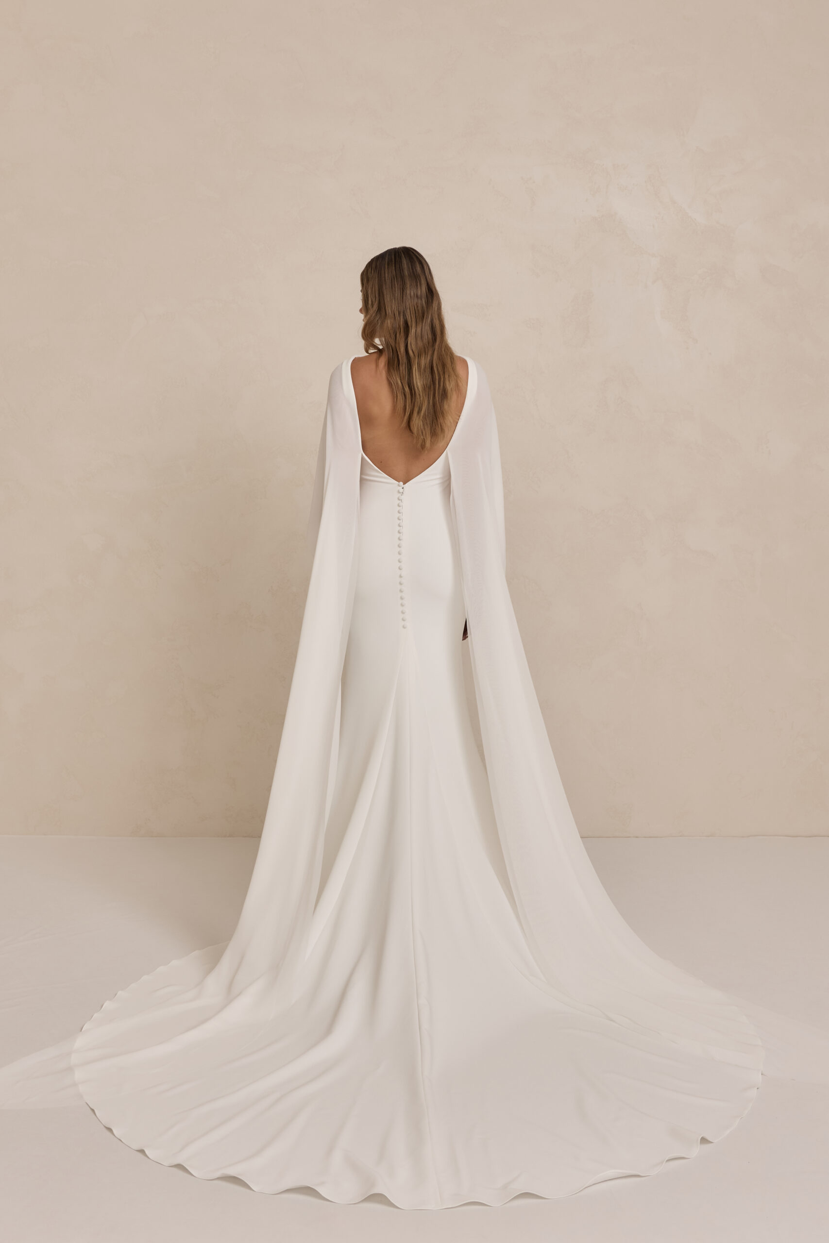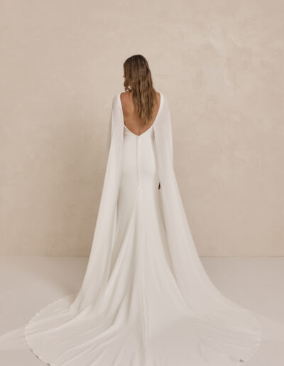 Crafted in sleek crepe, Gates features a sculpted, flowing silhouette. A striking low back adds bold, sensual elegance. The soft chiffon scarf can be worn as a wrap or draped over the shoulders for a romantic touch.