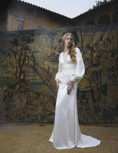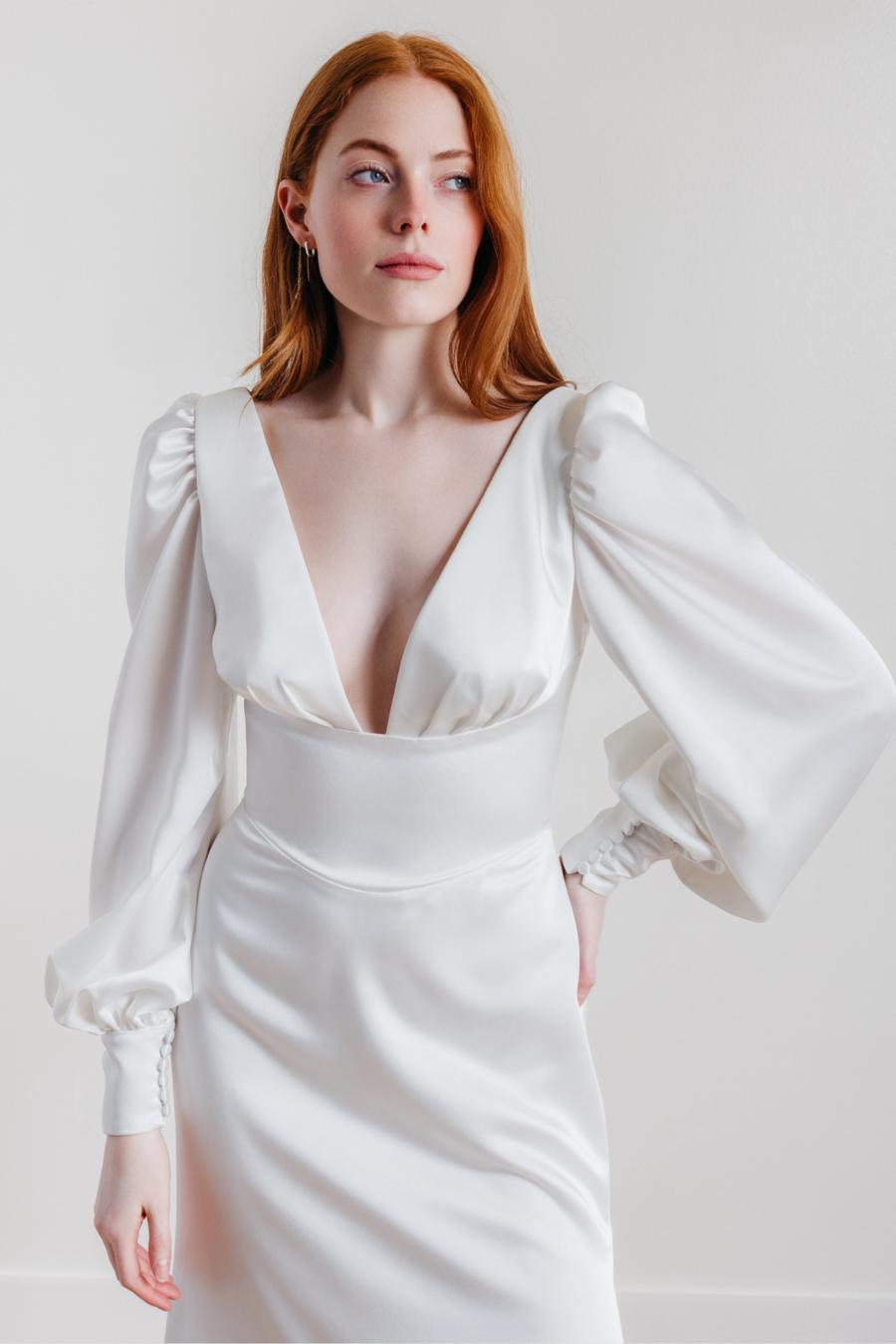 Ryle delights with the elegant sheath cut. This fluid gown features gathered bishop sleeves creating a sleek statement without saying a word. Pure sophistication for the bride who lives in the details.